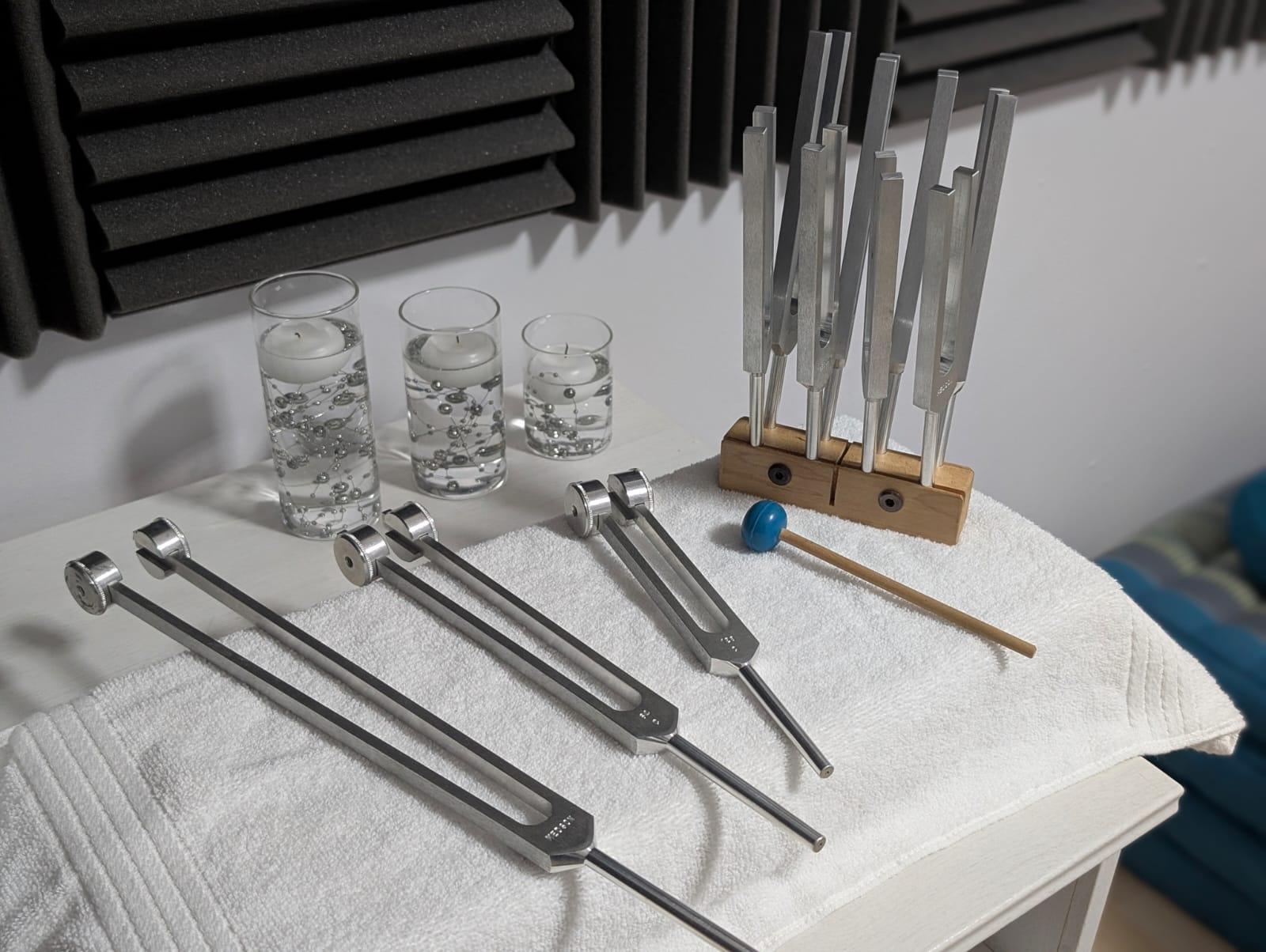 Les diapasons sont au cœur de la sonothérapie : leurs vibrations spécifiques invitent le corps et l'esprit à un profond lâcher-prise, facilitant ainsi la gestion du stress, l'apaisement des tensions musculaires et le retour à un état global d'équilibre.